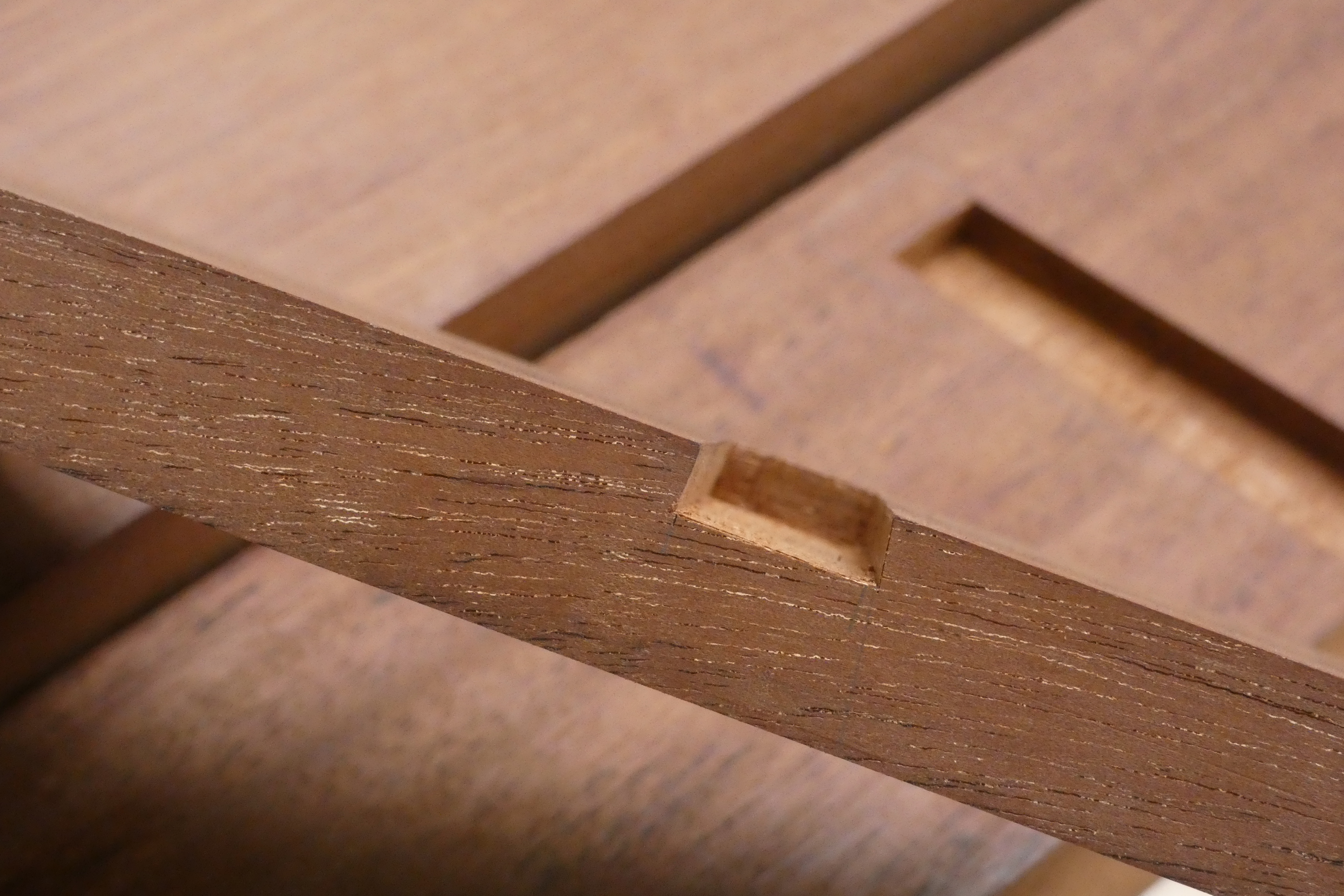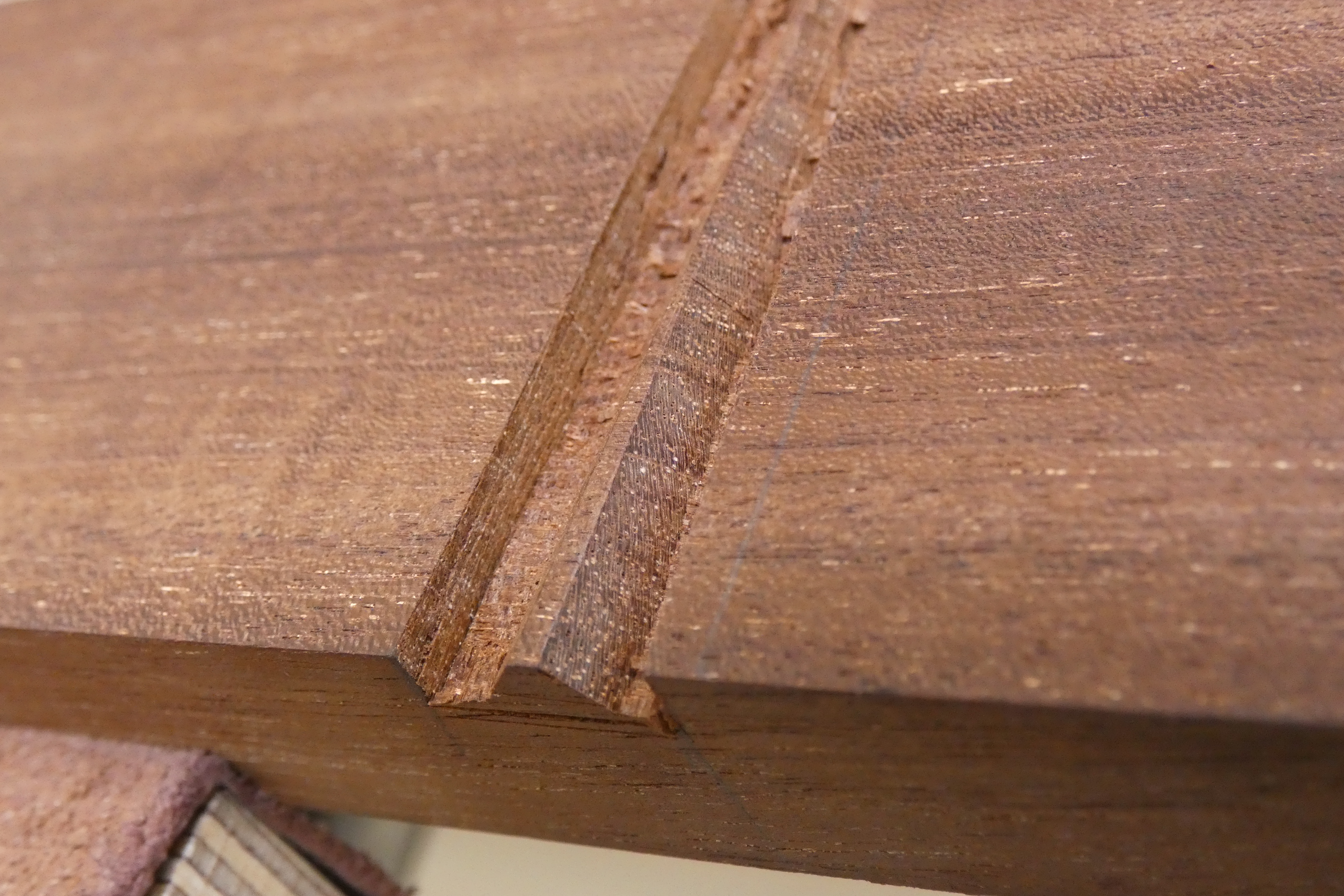 Why chop and not saw? Because sawing accurately to a knifewall is much more demanding than we generally think. That’s right, chopping is easier to get right, even though it may take longer. But again, accuracy (and not efficiency) is essential to making a good sliding dovetail, and that’s the aim for now. Efficiency can be discussed later, once the process is down. But even though I personally do saw down the walls when I’m working on deeper recesses, I still use a guide to pare to the exact angle. Also, bear in mind that chopping the walls compresses the ends of the wood fibres into themselves and leaves a crisp, solid wall.