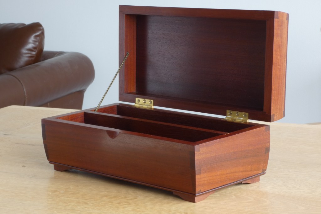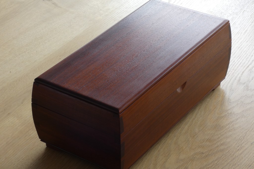 This particular box was made using the wood from a vintage mahogany drop leaf table. Perfectly straight quarter-sawn sections were chosen for the lid and front so as to not detract from the elegant design, whilst allowing the eventual owner the privilege of daily appreciating the stunning nature of this remarkable wood species that is no longer commercially available.